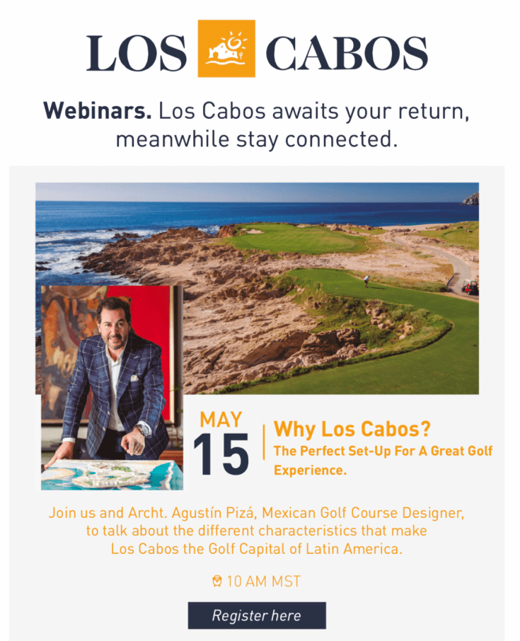 Join Los Cabos Tourism on Friday, May 15 with special guest Agustín Pizá , Mexican Golf Architect, for a special webinar on why Los Cabos is the ideal destination for golf.